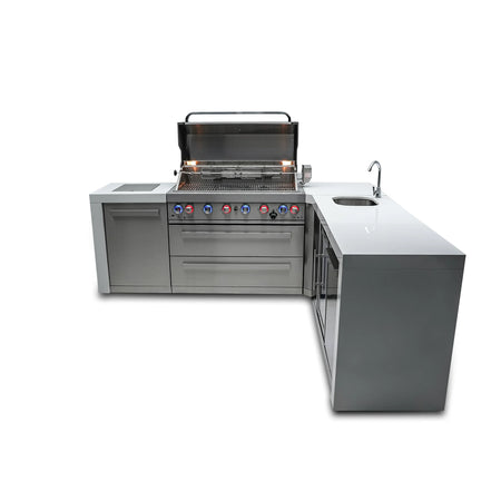 The Mont Alpi 805 Deluxe BBQ Grill Island with 90 degree corner features a 6-burner gas grill with a marine grade 304 stainless steel chasis and modern white waterfall granite side cabinets.