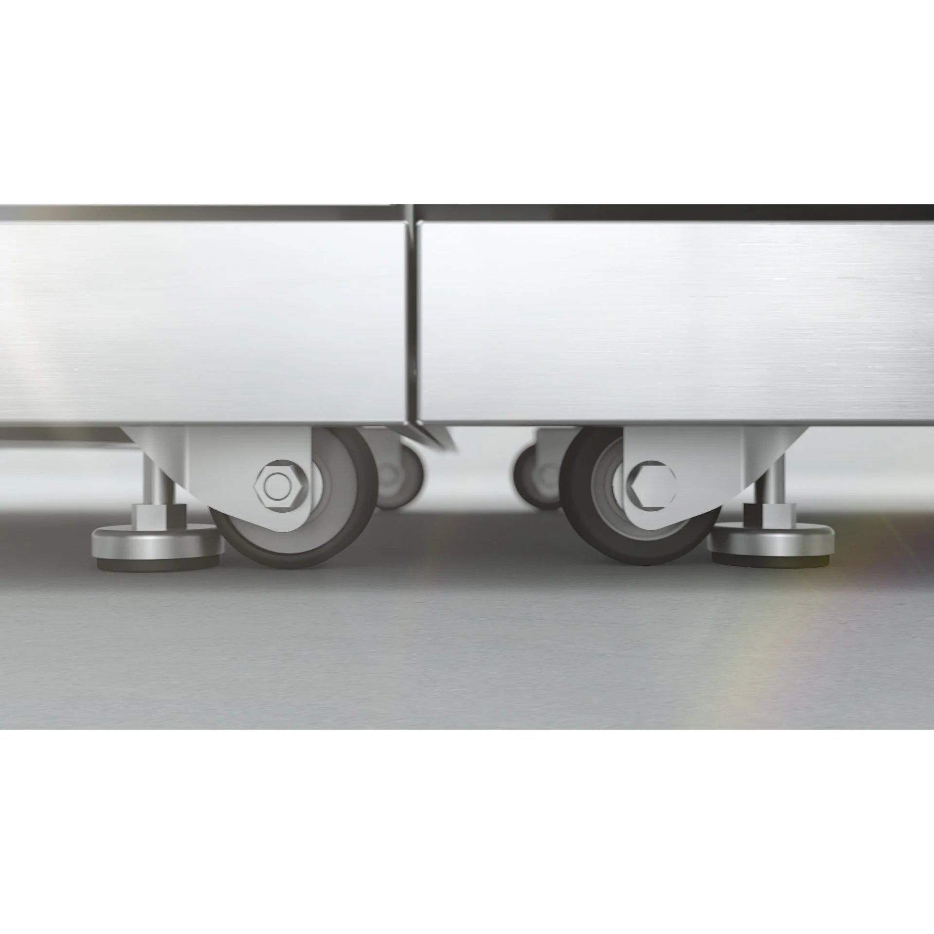 The caster wheels allow for the island to be moved around as needed. Once you have found the perfect spot, the wheel levelers will ensure your grill is stable. A heavy duty electric rotisserie kit, chopping board and heavy duty all weather cover are all included.