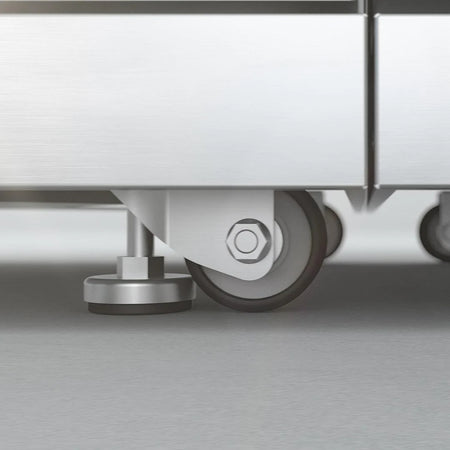 The caster wheels allow for the island to be moved around as needed. Once you have found the perfect spot, the wheel levelers will ensure your grill is stable. A heavy duty electric rotisserie kit, chopping board and heavy duty all weather cover are all included.
