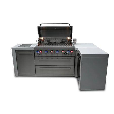 The Mont Alpi 805 Deluxe BBQ Grill Island with 90 degree corner features a 6-burner gas grill with a marine grade 304 stainless steel chasis and modern white waterfall granite side cabinets. It has a large 6 burner (115,000 BTU) grill with an additional infrared rear burner. A 90 degree corner cart is included.