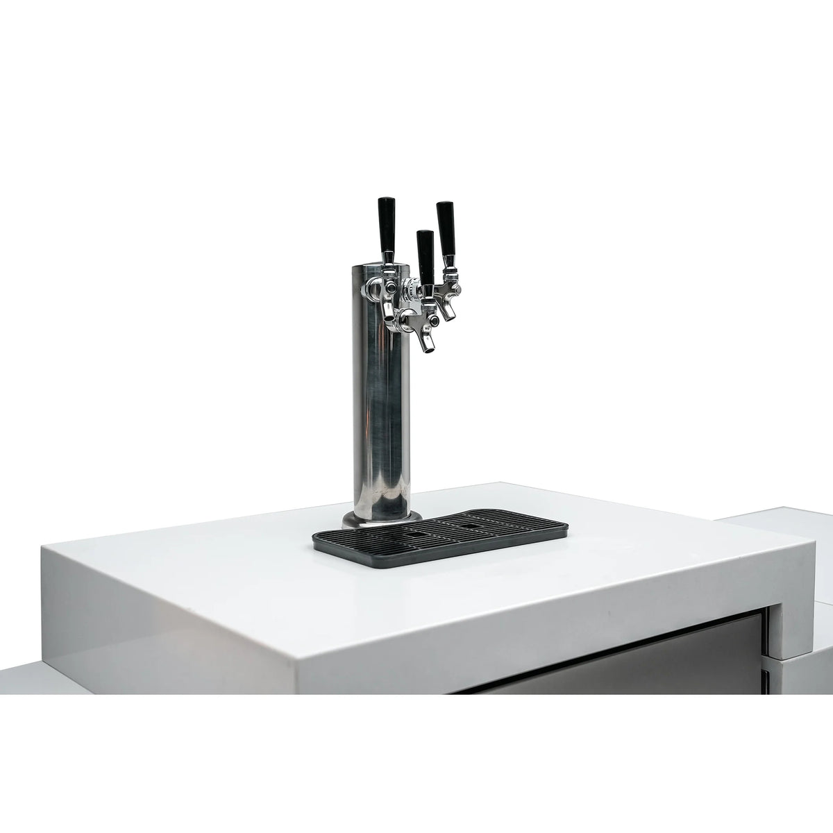 The 3 pour kegerator with granite top and drip tray is perfect for 3 barrels of beer (or other) and is cooled in an outdoor rated fridge for that perfect ice cold pint. The well-appointed beverage center comes standard with outdoor rated refrigerator and sink with faucet.