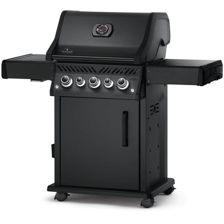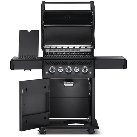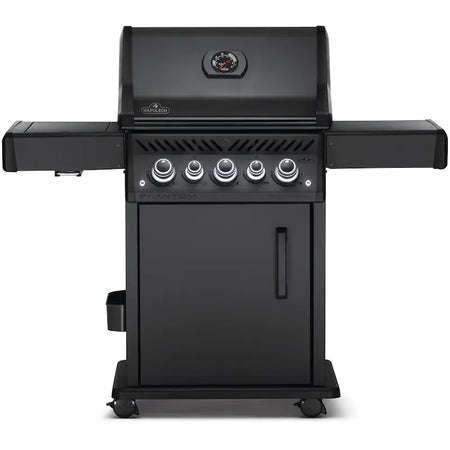 Napoleon Phantom Rogue SE 425 Gas Grill On Cart with Infrared Side and Rear Burners offers an impressive grilling package in a modern matte black design. Featuring durable stainless steel construction, the Napoleon Rogue SE will be a mainstay at your backyard barbecues for many years to come. Featuring three main burners, a rear rotisserie burner, and a high top lid, this grill offers dynamic cooking potential as well as a convenient design. An integrated sear station helps create restaurant-style results, while generous side shelf space ensures you'll always have plenty of room to add finishing touches when prepping your meals.
