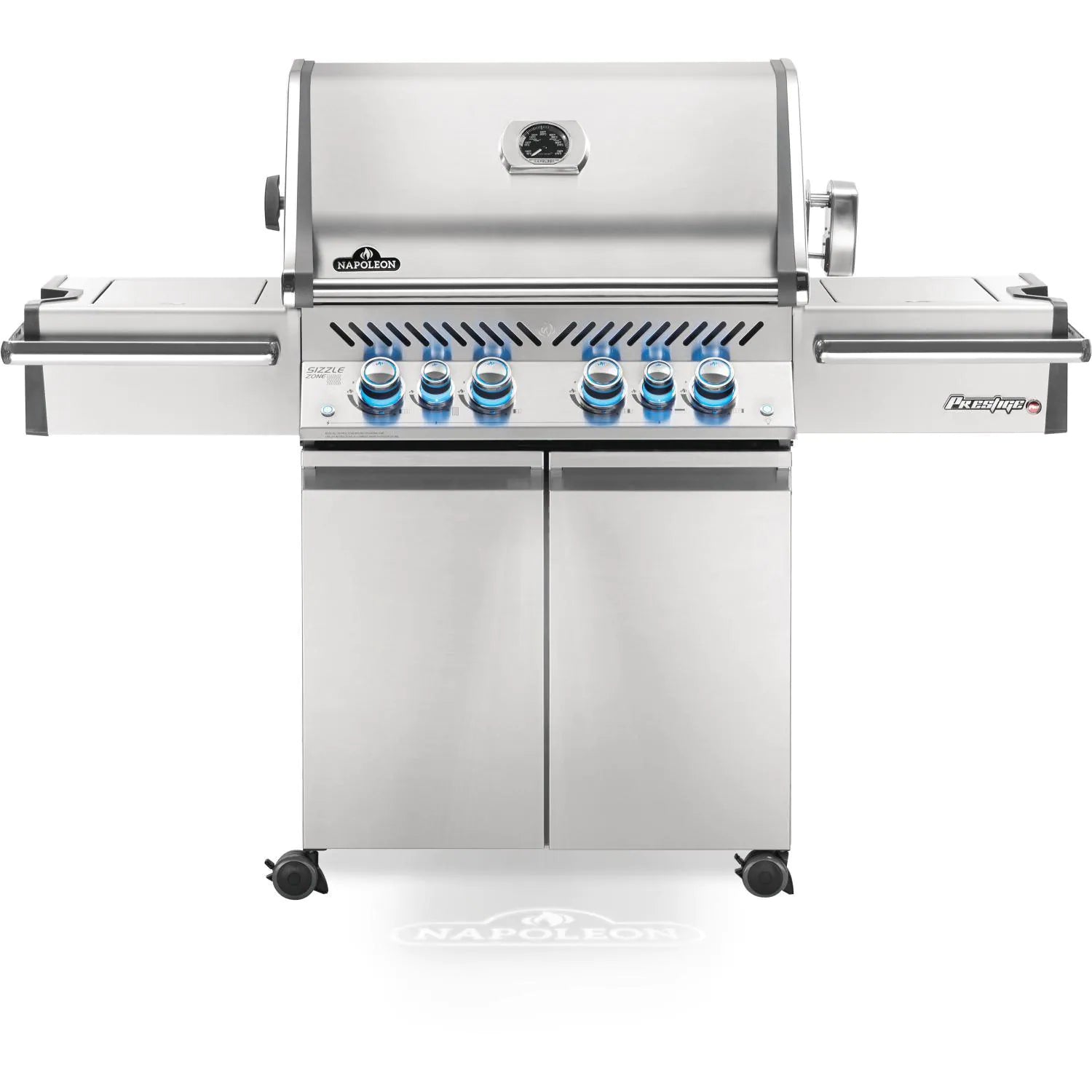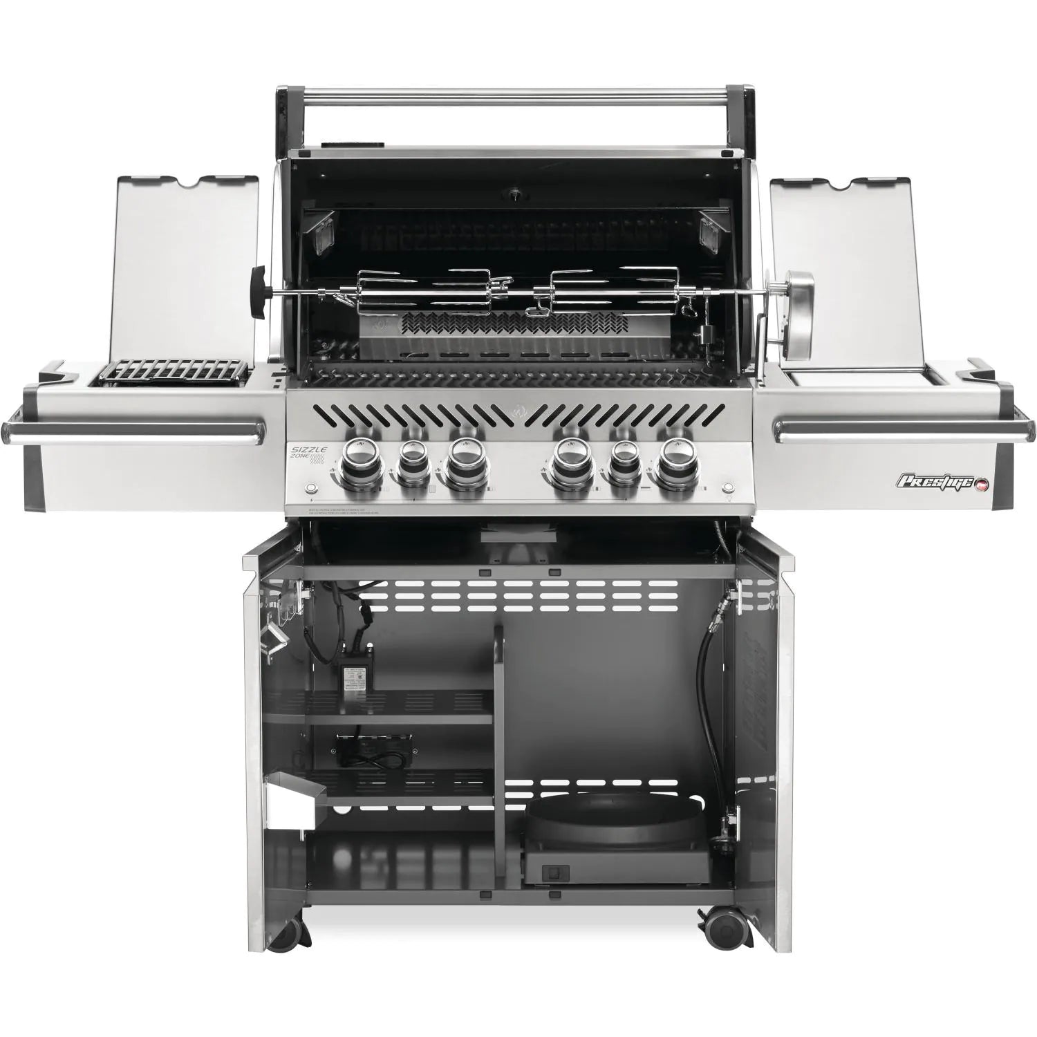 Napoleon PRO500RSIBSS-3 Prestige PRO 500 Gas Grill On Cart with Rotisserie and Side Burner, 28-Inches delivers high end performance without the price tag of a high end grill. The solid 304 stainless steel construction is designed for long term durability and ensures the grill will hold up to the elements. The (4) main grilling burners are rated for a 12,000 BTU maximum and feature a solid 304 stainless steel tube construction while the stainless steel sear plates help protect the burners and provide even heat distribution, preventing hot and cold spots across the 500in² grill surface.