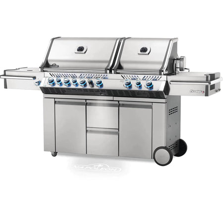 Napoleon PRO825RSBISS-3 Prestige PRO 825 Series Gas Grill On Cart with Rotisserie and Side Burner, 45-Inches delivers high end performance without the price tag of a high end grill. The solid 304 stainless steel construction is designed for long term durability and ensures the grill will hold up to the elements. The (4) main grilling burners are rated for a 12,000 BTU maximum and feature a solid 304 stainless steel tube construction while the stainless steel sear plates help protect the burners and provide even heat distribution, preventing hot and cold spots across the 500in² main grill surface while the secondary grill hood features (2) 14,000 BTU ceramic infrared burners that can reach up to 1,800 F to achieve steakhouse quality searing; also included is an independent 8,000 BTU warming burner for added versatility.