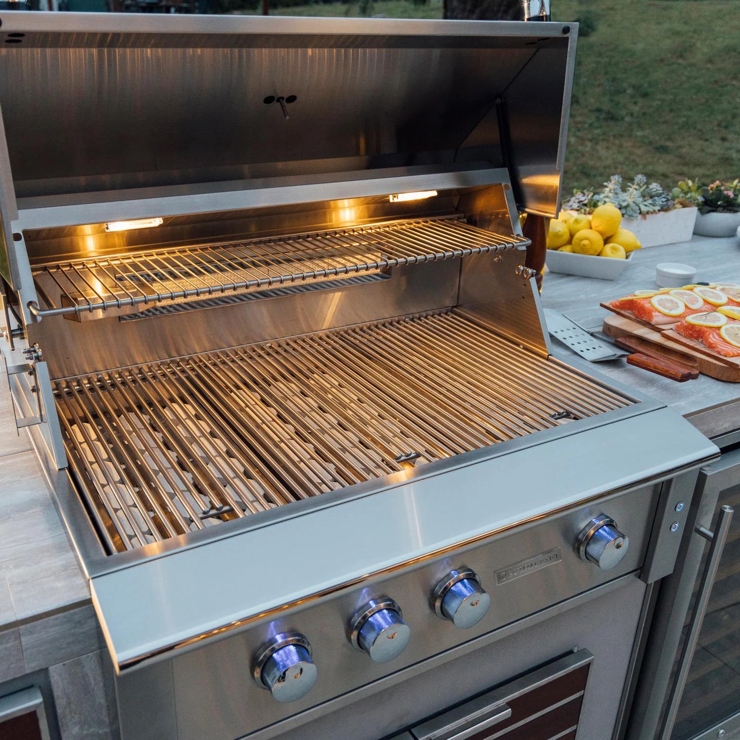 Summerset ALT36 Alturi Series Built-In Gas Grill, 36-Inch combines superior quality and high end performance to provide a terrific option to complete your outdoor kitchen. The grill features a solid 304 stainless steel construction to ensure durability and longevity while each of the (3) heavy duty stainless steel U-Tube burners, rated at 20,000 BTU, provide ultra high heat to the unique captured briquette trays. The captured briquette trays provide even radiant heat across the 945in² cooking surface and eliminate hot and cold zones as the 9mm thick stainless steel grates offer a thick gauge grilling surface for professional style grill marks.