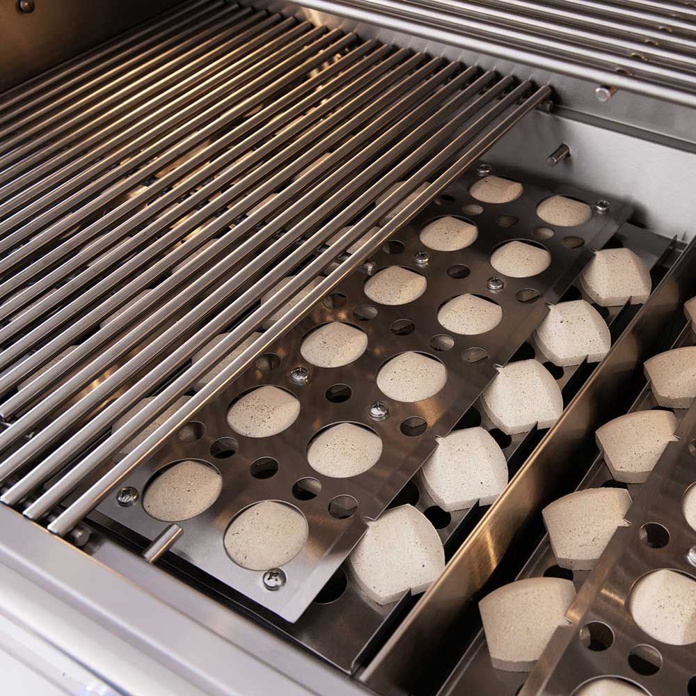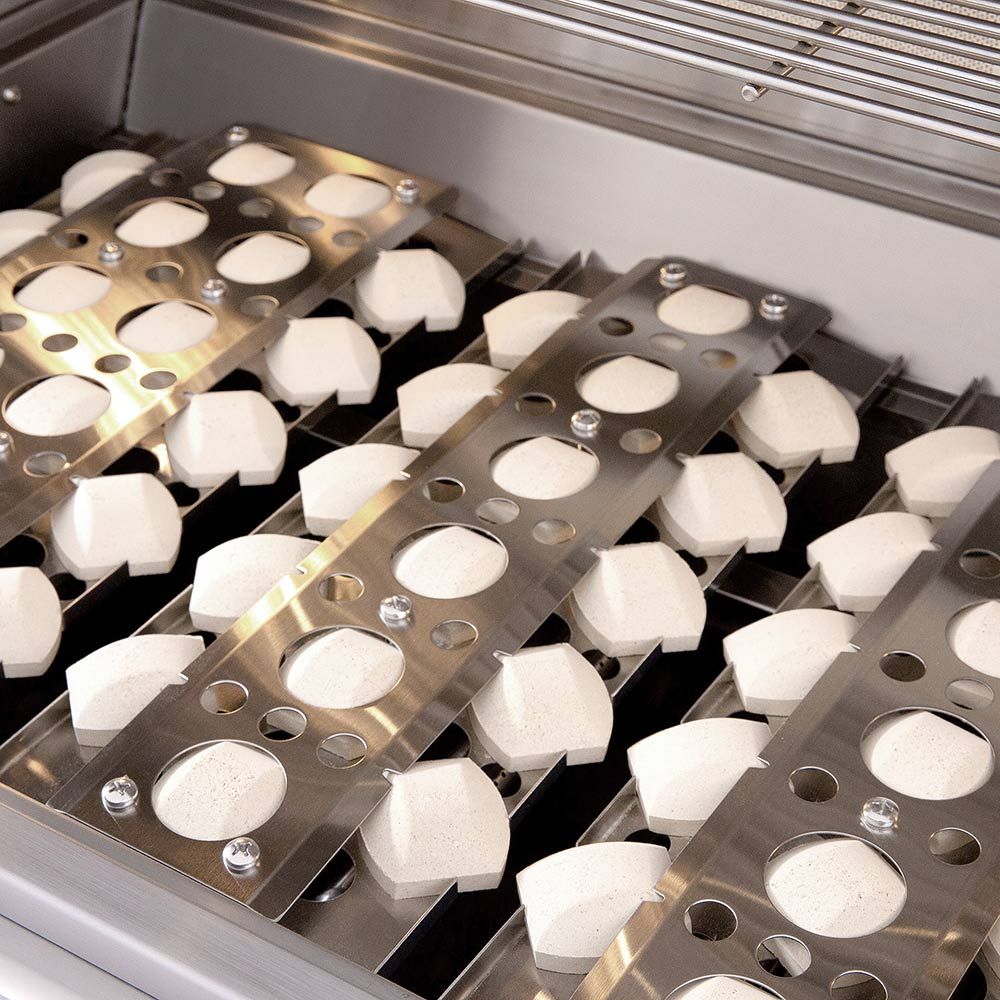 • Captured Briquette Trays - Unique ceramic briquettes sit above the burner to provide radiant heat and eliminate hot/cold zones across the 1076in² cooking surface