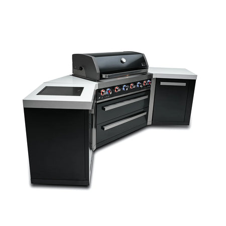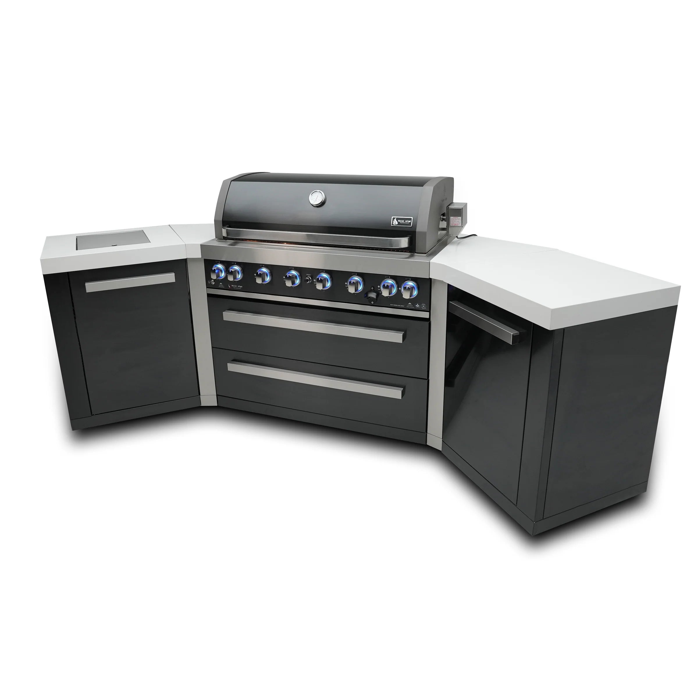 The Mont Alpi 805 Deluxe BBQ Grill Island with 45 degree corners features a 6-burner gas grill with a marine grade 304 black stainless steel chasis and modern white granite side cabinets.