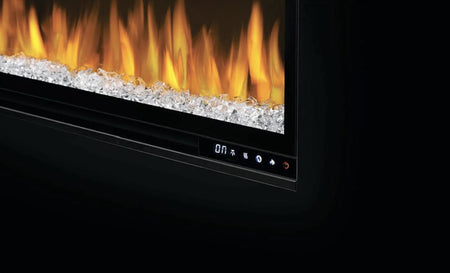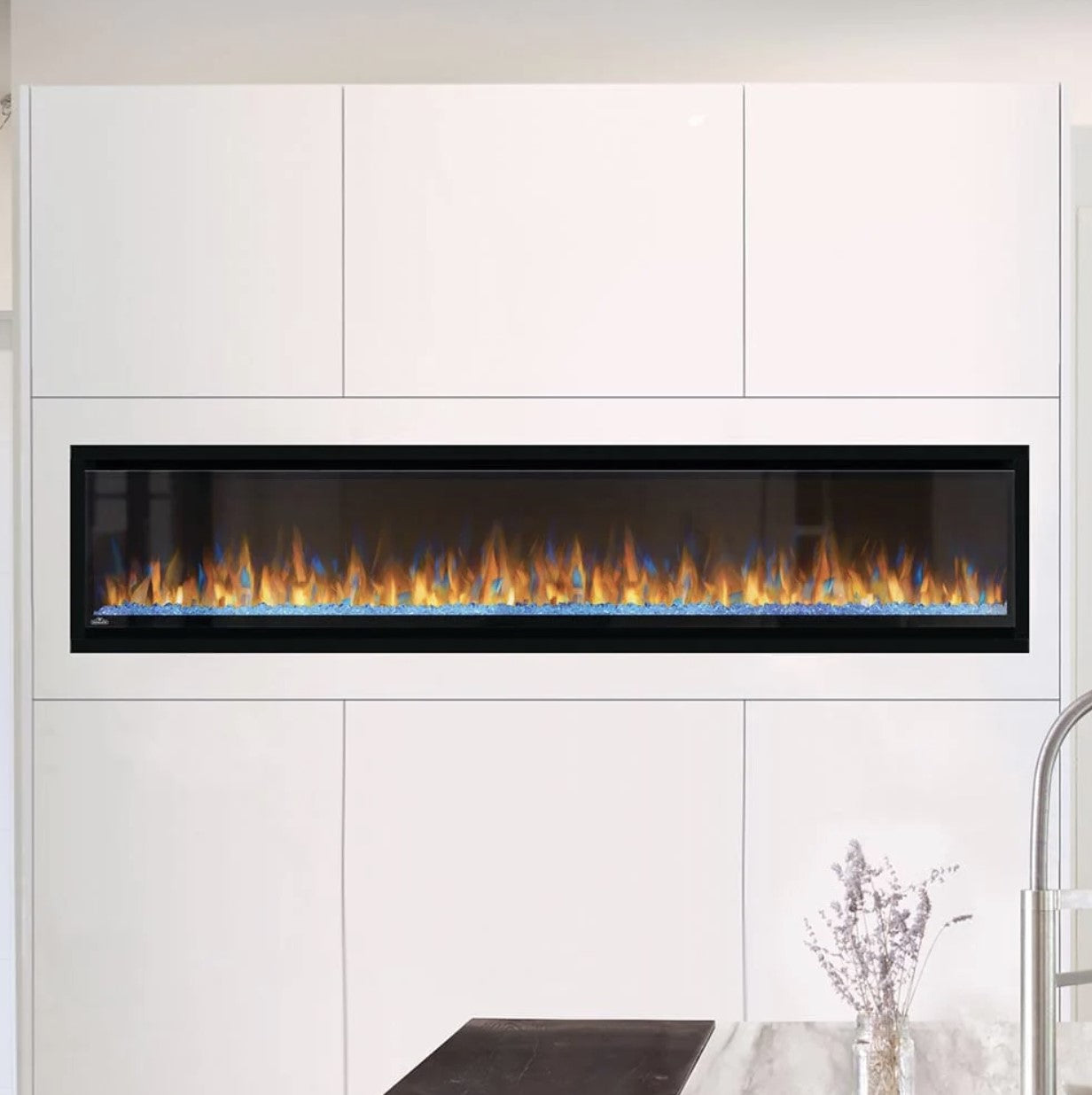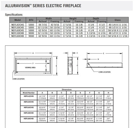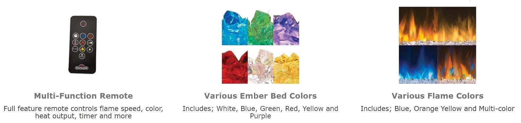 Napoleon NEFLxxCHS-1 Alluravision Slimline Linear Electric Fireplace provides a premium electric fireplace alternative for your perfect living space. Featuring an almost-frameless viewing area and unique flame colors, the Alluravision Series stands out from all others. Known for ease of use, this fireplace is simply plug and play--just hang on the wall and plug it in! For those who like a recessed fireplace, that option is available as well. Enjoy a slim depth fireplace that includes a Night Light effect to fit your viewing area preferences. The included remote makes it easy to set the mood (enjoy yellow, orange, blue or combined flame options), while the 5 different size options make it possible to complement any size of space. The Alluravision Fireplace offers stunning LED lighting, flame/heat adjustment, a blower-boost function and can be hard-wired. The Crystal Clear Cube Ember Bed helps finish off a unit that is sure to enhance the focal point of your room or home.