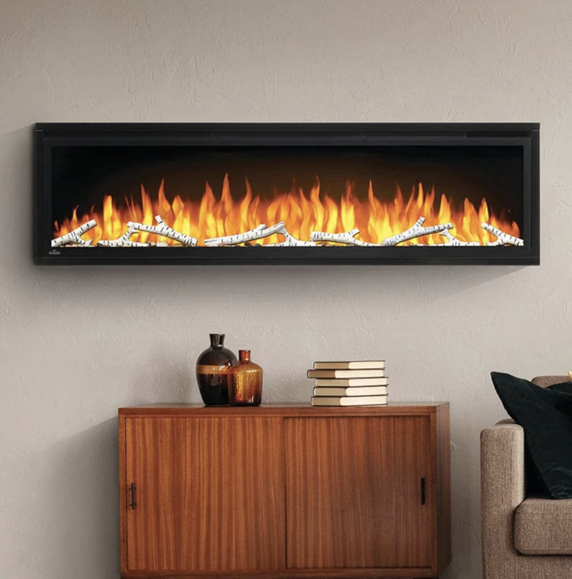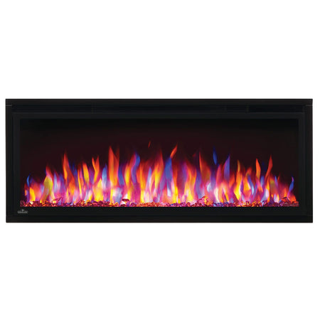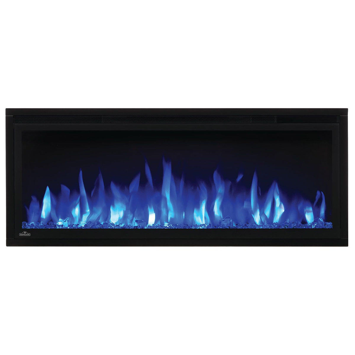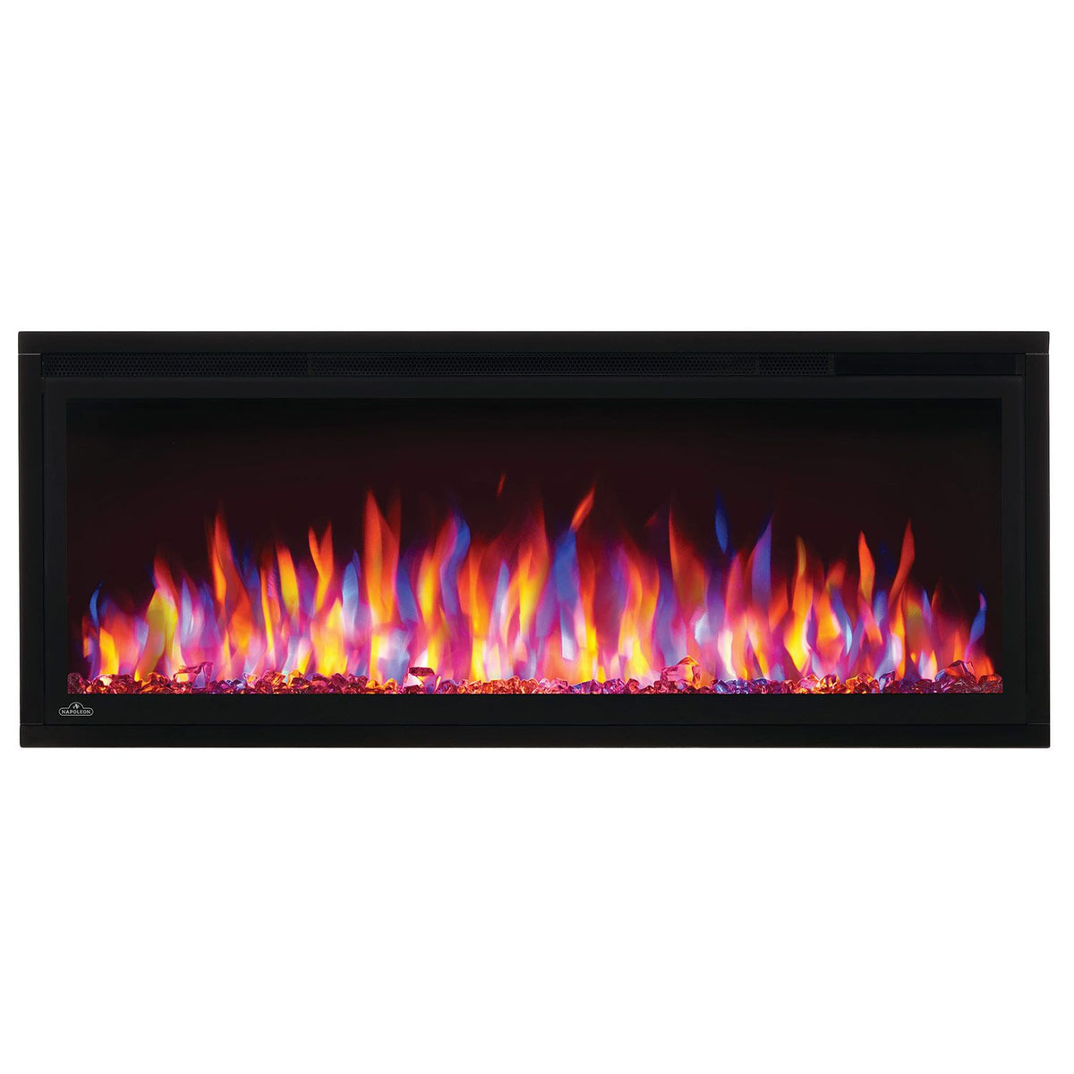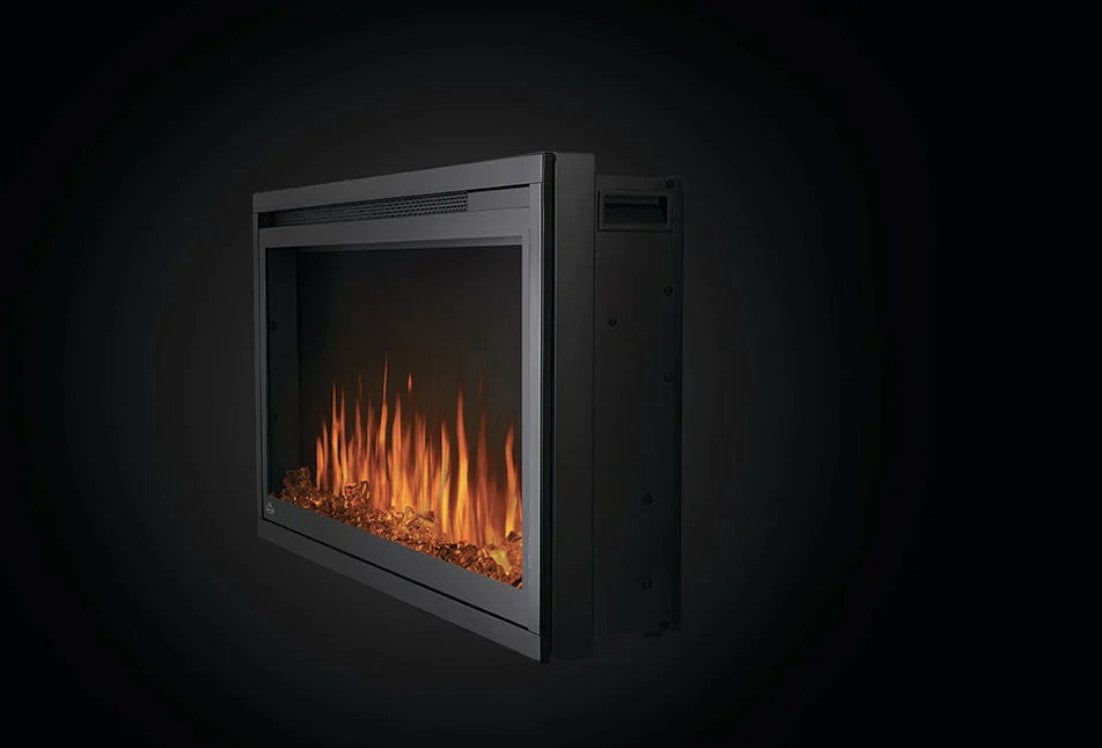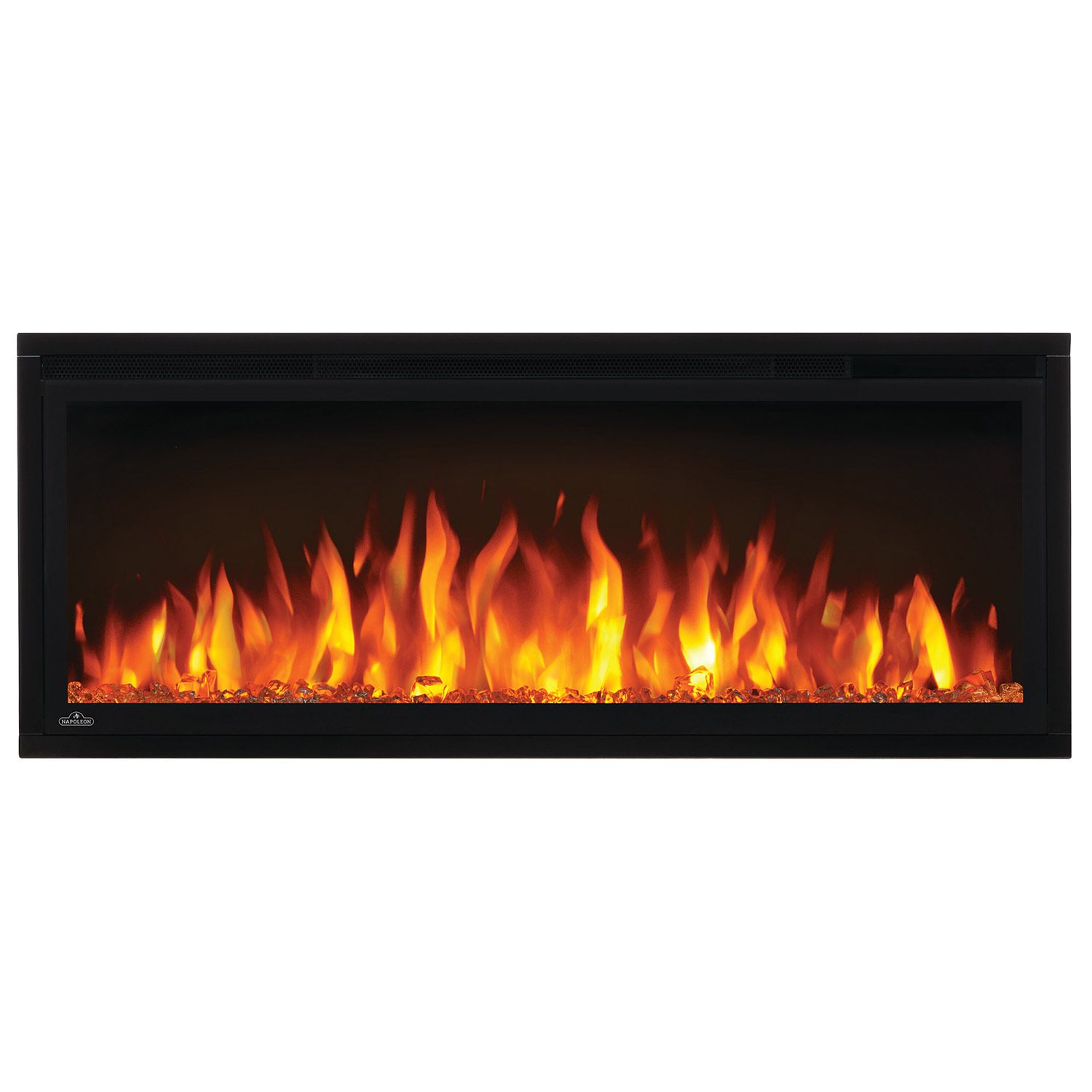 Napoleon Entice Series Electric Fireplace with Crystal Ember Media provides a beautiful electric fireplace option to enhance your favorite indoor living space. With a clean face design and large viewing area, the Napoleon Entice makes a great addition to any room. Additionally, this unit can be wall mounted, semi-recessed, or fully recessed with both plug-in and hardwiring options to give greater installation versatility. The Entice series includes contemporary crystal media, while two different log sets can be added as optional media. Blue, orange, and multi-colored flame options further enhance appearance, while fade-in and fade-out modes for the ember bed add ambiance. An integrated 5,000 BTU heater can zone heat approximately 400 square feet to create a cozy atmosphere in any room, while overheat protection and a child safety lock function allow for selective disabling of the heat. A touch control panel with a premium display window offers easy control, while an included fully featured remote control offers added convenience. Switch from a traditional gas or wood fireplace and enjoy the cost savings and convenience provided by an electrically powered fireplace--perfect for remodeling or new construction.