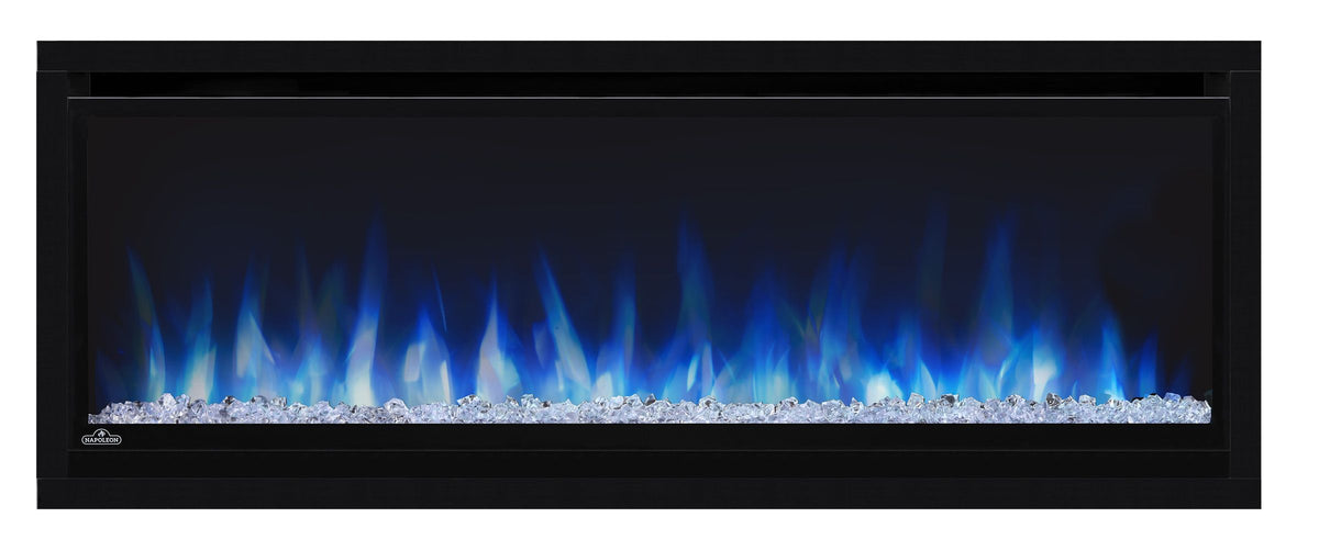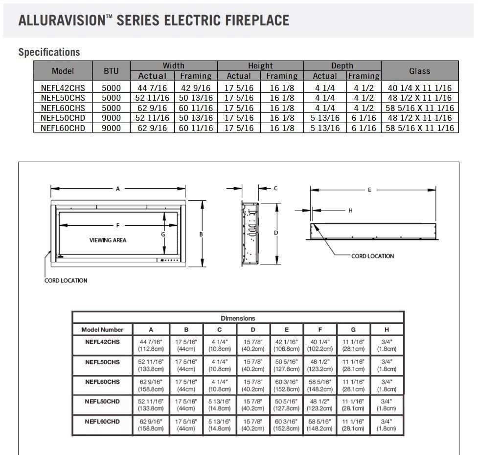 Napoleon NEFLxxCHD-1 Alluravision Deep Depth Linear Electric Fireplace provides a premium electric fireplace alternative for your perfect living space. Featuring an almost-frameless viewing area and unique flame colors, the Alluravision Series stands out from all others. Known for ease of use, this fireplace is simply plug and play--just hang on the wall and plug it in! For those who like a recessed fireplace, that option is available as well. Enjoy a deep-depth fireplace that includes the driftwood log set and a Night Light effect to fit your viewing area preferences. The included remote makes it easy to set the mood (enjoy yellow, orange, blue or combined flame options), while the 5 different size options make it possible to complement any size of space. The Alluravision Fireplace offers stunning LED lighting, flame/heat adjustment, a blower-boost function and can be hard-wired. The Crystal Clear Cube Ember Bed helps finish off a unit that is sure to enhance the focal point of your room or home.