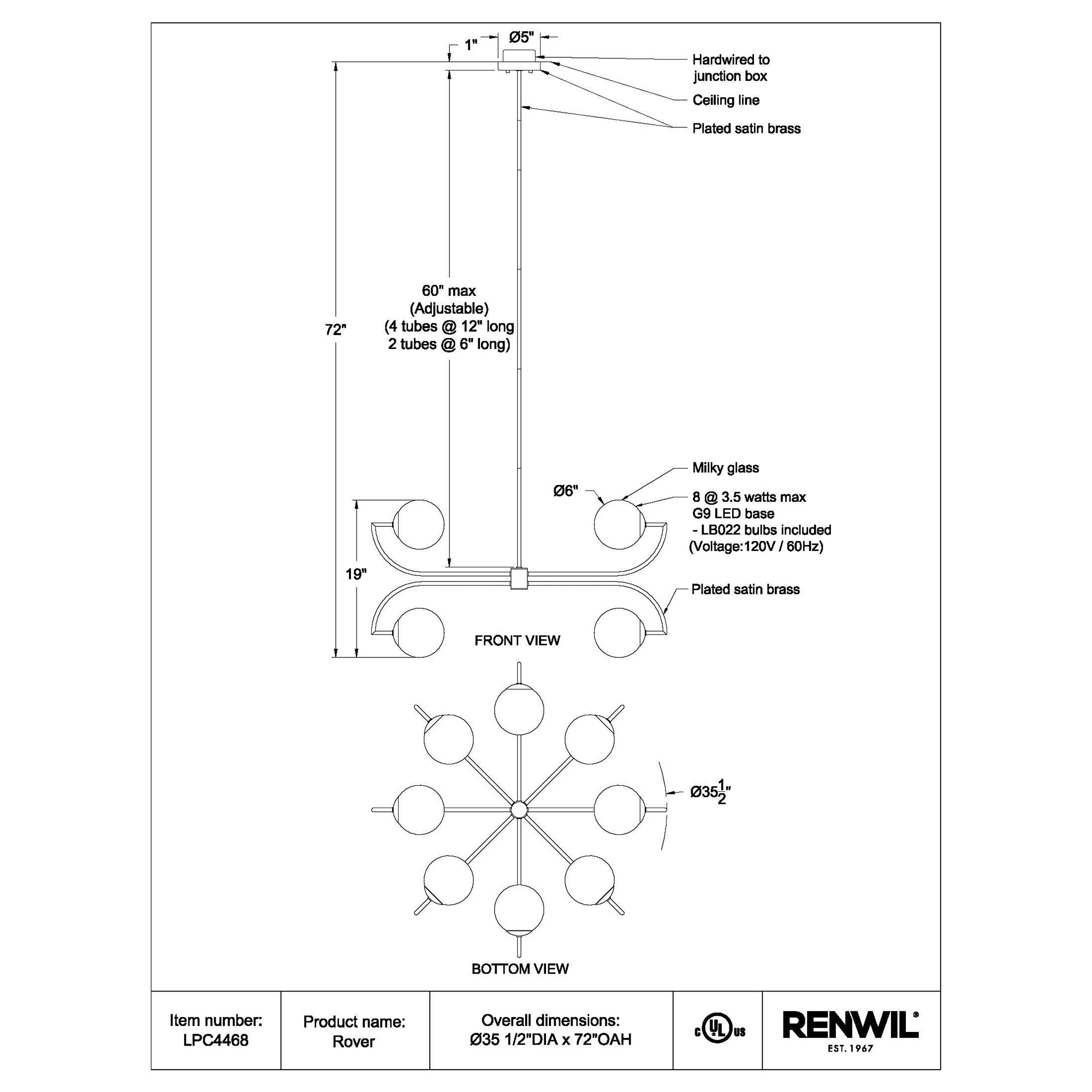 The Rover pendant is a modern and sophisticated design with intricate details such as frosted glass bulbs, and a brass metal frame. This striking fixture is 36 inches in diameter, making it the perfect size for dining rooms, living rooms, or bedrooms. It can also be used to create a showstopper for high-ceiling spaces like an entrance or staircase.