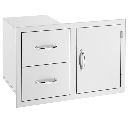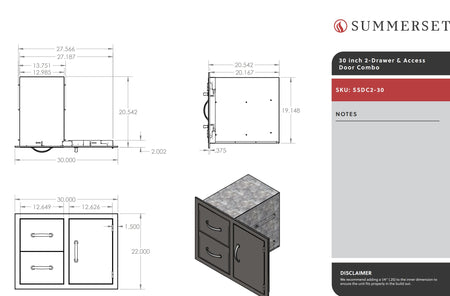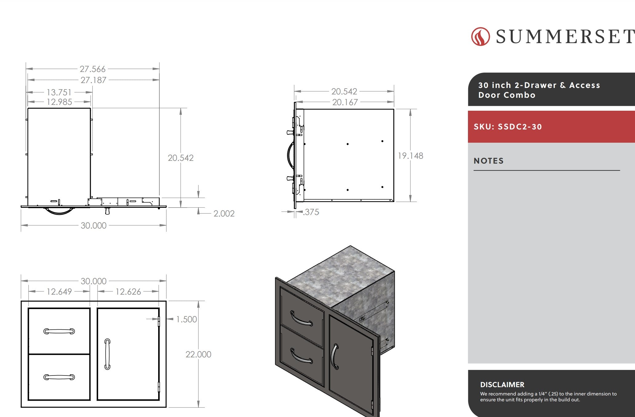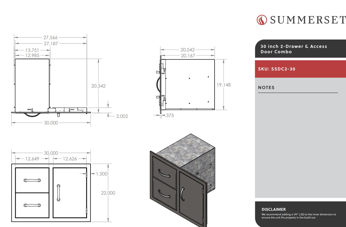 Summerset SSDC2-30 Access Door & Double Drawer Combo, 30-Inch provides a high quality access door option--a terrific addition to your custom outdoor kitchen. The high quality 304 stainless steel construction ensures a long lasting product, while the stainless steel mounting bracket provides a durable frame to mount the door to your grill island. The matching Summerset handles coordinate with the Summerset line of grills for a seamless look and the magnetic latch provides a secure closure. Be sure to complete your outdoor kitchen with everything that you need, including this two-drawer and one-door combo unit from Summerset.