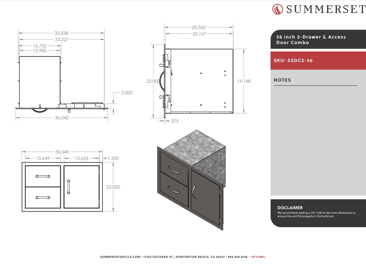 Summerset SSDC2-36 Access Door & Double Drawer Combo, 36-Inch provides a high quality access door option--a terrific addition to your custom outdoor kitchen. The high quality 304 stainless steel construction ensures a long lasting product, while the stainless steel mounting bracket provides a durable frame to mount the door to your grill island. The matching Summerset handles coordinate with the Summerset line of grills for a seamless look and the magnetic latch provides a secure closure. Be sure to complete your outdoor kitchen with everything that you need, including this two-drawer and one-door combo unit from Summerset.