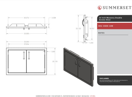 Summerset SSDD-33M Double Access Doors with Masonry Frame, 33-Inch provides a durable frame to mount the door to your grill island. The high quality 304 stainless steel construction ensures a long lasting product, while the stainless steel mounting bracket provides a durable frame to mount the door to your grill island. The matching Summerset handles coordinate with the Summerset line of grills for a seamless look and the magnetic latch provides a secure closure. Be sure to complete your outdoor kitchen with everything that you need, including these 30" Double Access Masonry Doors from Summerset.