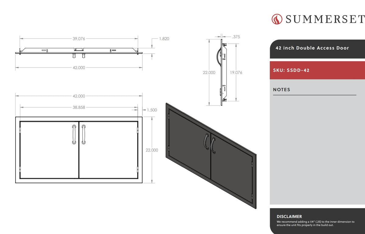 Summerset SSDD-42 Double Access Doors, 42-Inch provide durable doors for your grill island. The high quality 304 stainless steel construction ensures a long lasting product, while the stainless steel mounting bracket provides a durable frame to mount the door to your grill island. The matching Summerset handles coordinate with the Summerset line of grills for a seamless look and the magnetic latch provides a secure closure. Be sure to complete your outdoor kitchen with everything that you need, including these double access doors from Summerset.