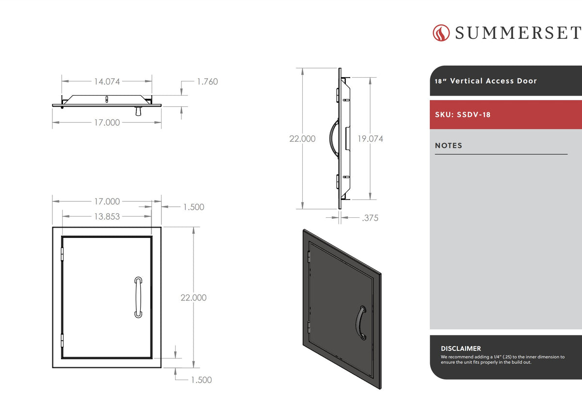 Summerset SSDV-18 Vertical Access Door, 18x22-Inch provides a high quality access door option--a terrific addition to your custom outdoor kitchen. The high quality 304 stainless steel construction ensures a long lasting product, while the stainless steel mounting bracket provides a durable frame to mount the door to your grill island. The matching Summerset handle coordinates with the Summerset line of grills for a seamless look and the magnetic latch provides a secure closure. Be sure to complete your outdoor kitchen with everything that you need, including this vertical door from Summerset.