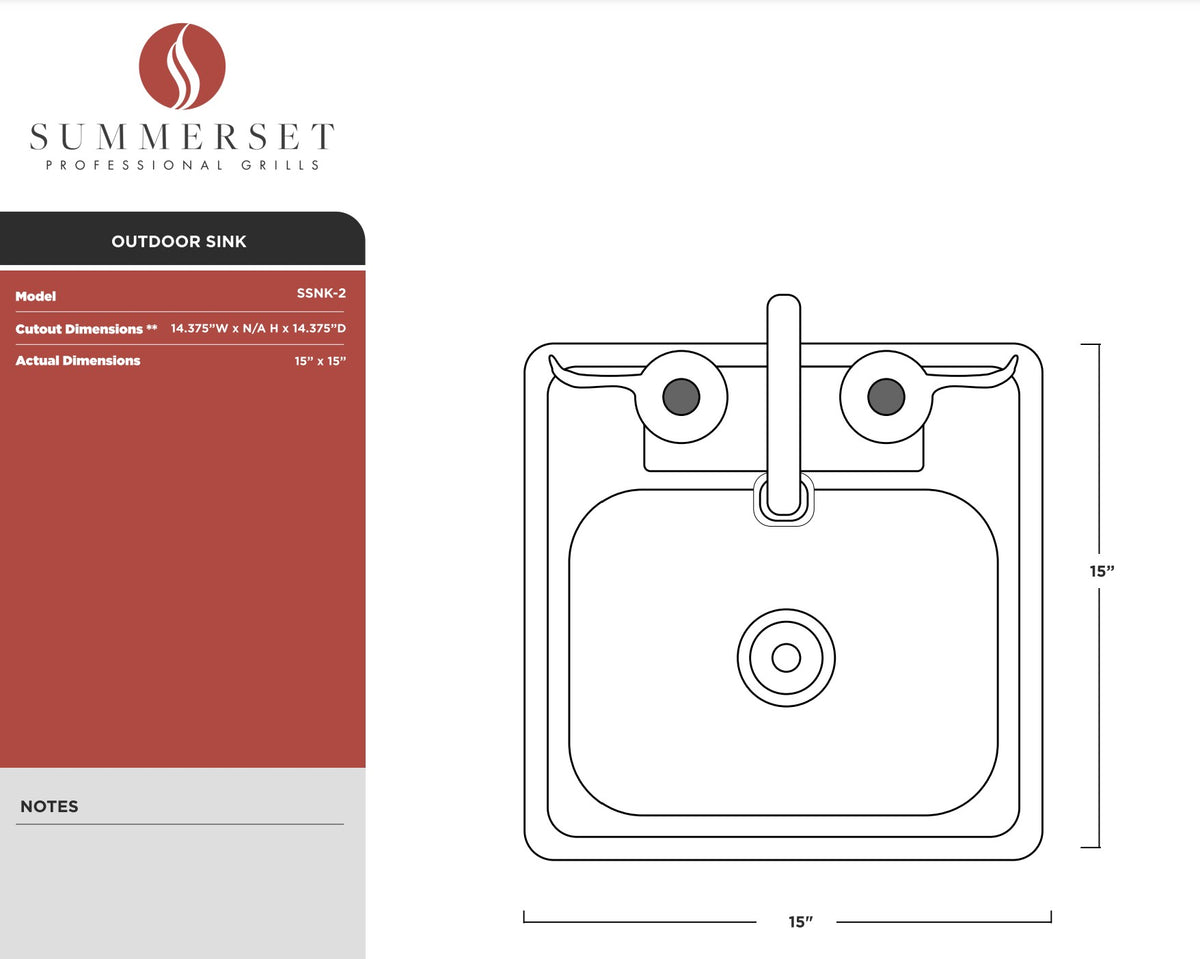 Summerset SSNK-15D Drop In Sink and Faucet provides a premium sink and faucet option for your outdoor kitchen. Bring the convenience of your indoor kitchen to your backyard with this 304 stainless steel unit built with durability in mind. With its gooseneck faucet, this sink offers a simple contemporary look to match nearly any decor--it also accommodates larger pots, pans, and dishes with ease. Two handles allow full control of both hot and cold water for simplicity and ease of use. As an added bonus, this sink includes a stopper plug for use as needed. Upgrade your outdoor kitchen with help from Summerset.
