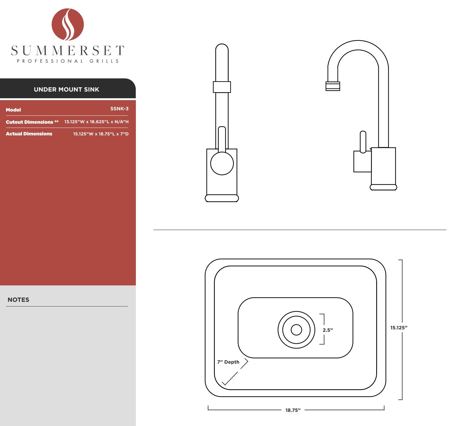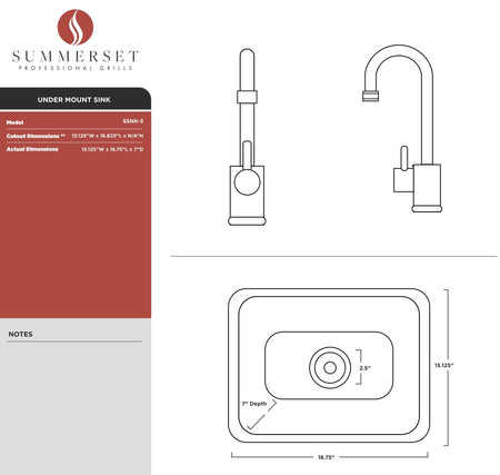 Summerset SSNK-19U Under Mount Sink and Faucet provides a premium sink and faucet option for your outdoor kitchen. Bring the convenience of your indoor kitchen to your backyard with this 304 stainless steel unit built with durability in mind. With its gooseneck faucet and under mount design, this sink offers a simple contemporary look to match nearly any decor--it also accommodates larger pots, pans, and dishes with ease. A single handle allows full control of both hot and cold water for simplicity and ease of use. As an added bonus, this sink includes a stopper plug for use as needed. Upgrade your outdoor kitchen with help from Summerset.